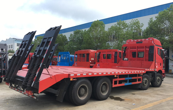 底盤配置:本車采用錫柴350馬力發動機,解放12檔變速箱,5噸雙前橋,13或16噸后雙橋,300mm雙層大梁,1100R20鋼絲胎,電動門窗、自動空調、原廠ABS、行車記錄儀,氣囊座椅。 上裝配置:平板底板橫梁采用120*120*5mm方管,底板采用8mm/10mm/12mm花紋板,帶加密斜支撐,爬梯采用雙彈簧加強型設計,采用三道筋+雙彈簧加固焊接,可選裝液壓爬梯或折疊加長型液壓爬梯,斜坡處帶后支腿,平板有效板長8.9米(含斜坡),板寬2.55米(可手動伸展至3.2米寬),可以選擇貨箱帶欄板設計,35噸及以下噸位挖機首選車型! 該車公告+燃油+環保齊全,全國上戶無憂。